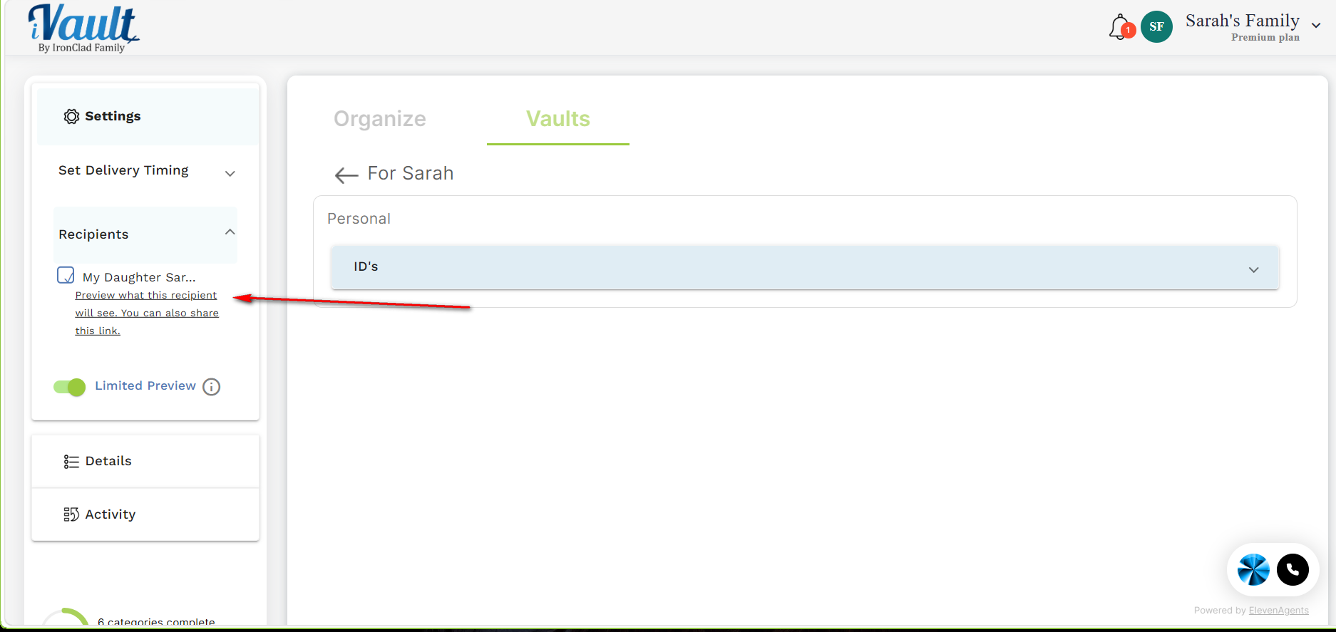 In the left pane, click Recipients to assign who receives the vault. Each vault supports up to 4 recipients. For families with more than 4 people, create separate vaults for different recipient groups.