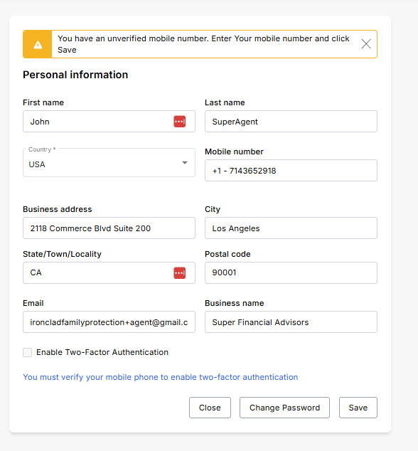 Update your profile any time your firm identity, phone number, or contact details change. If you use SMS-based verification or SMS 2FA, your phone number must be correct.