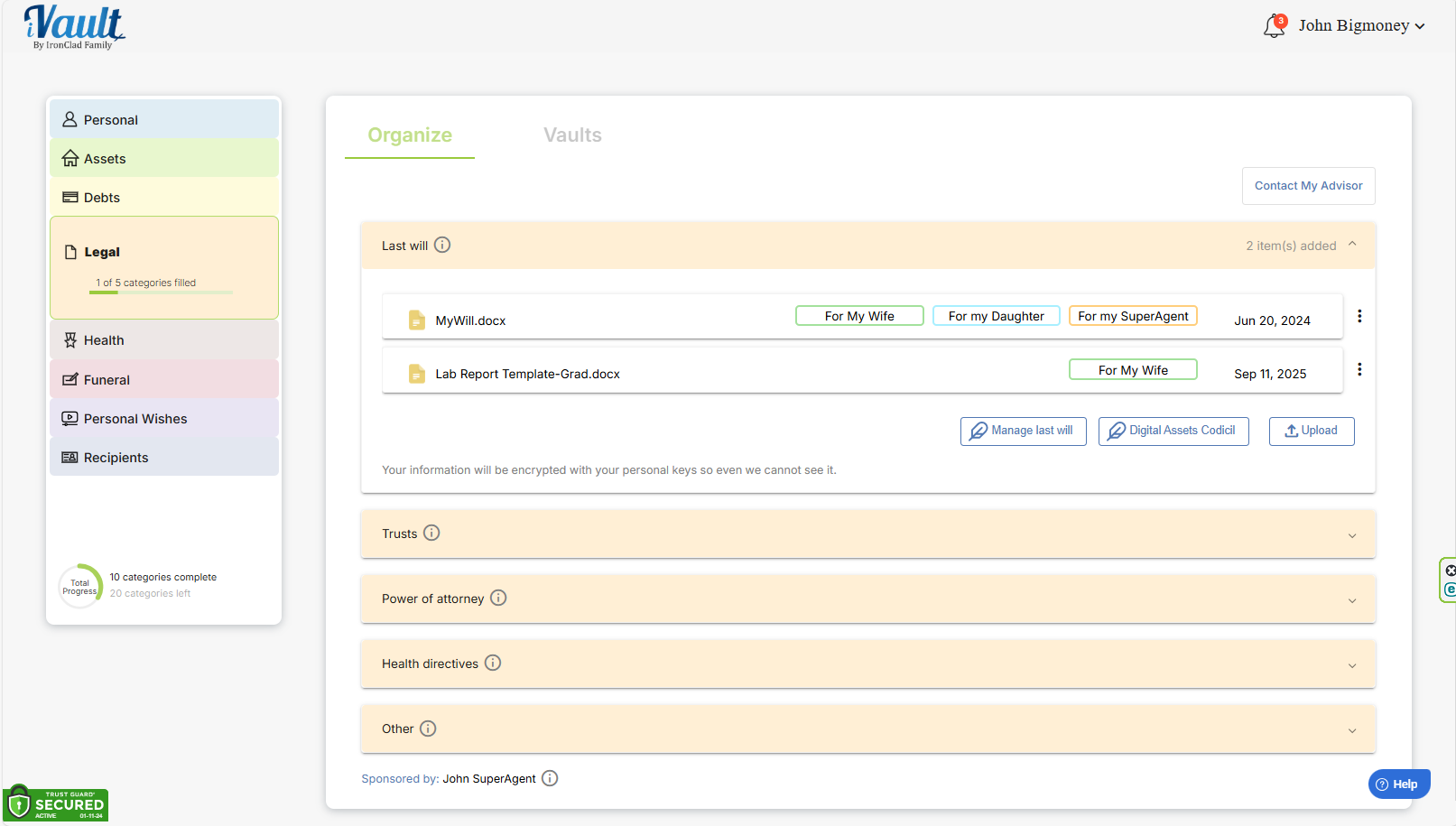 - Start with minimum viable completeness: get core estate/insurance/ID/property documents into the vault first.
