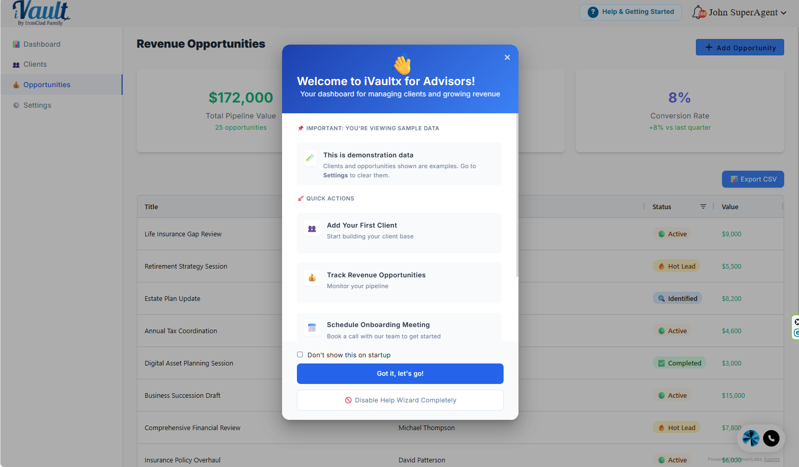 - This opens the onboarding guide that links to the key first actions (Clients, Opportunities, Settings, and scheduling onboarding).