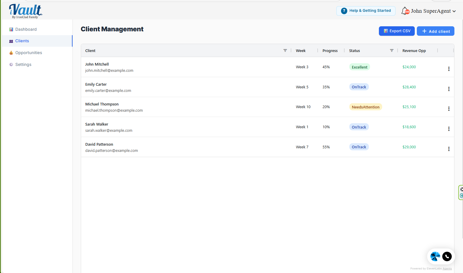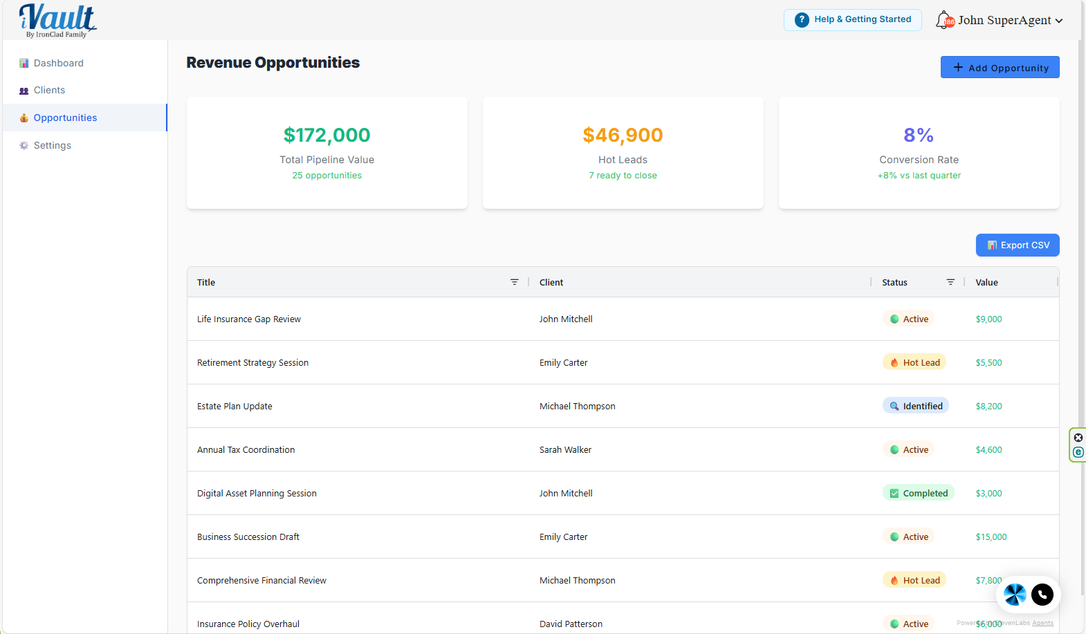 - If you see it, the clients and opportunities in your account are examples, not real data.