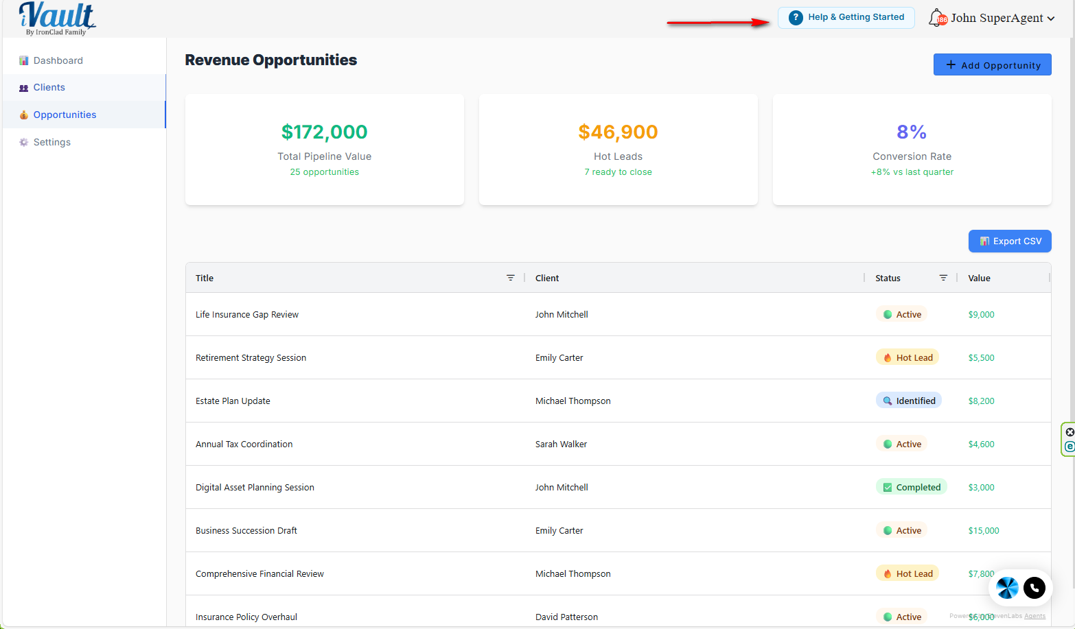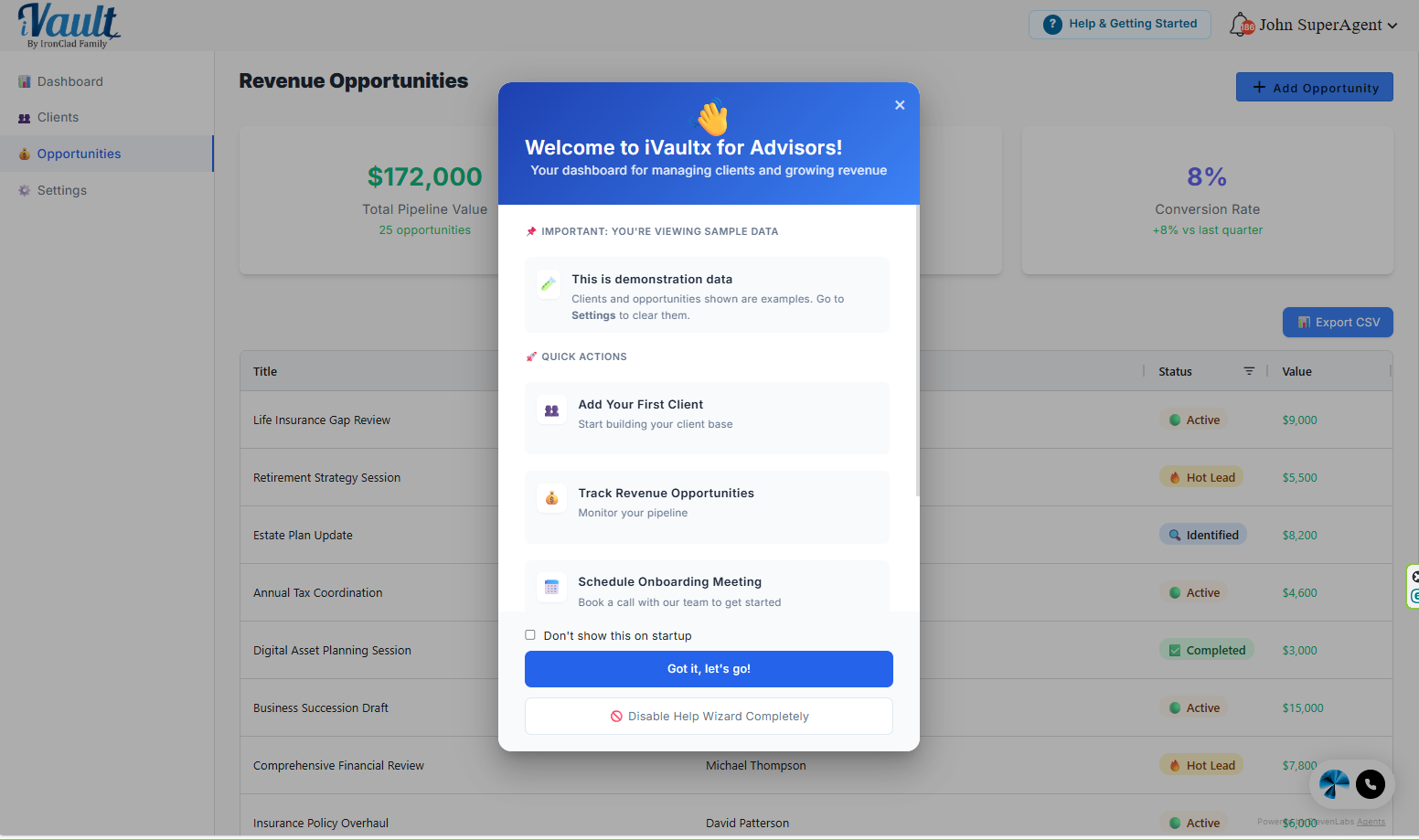 iVaultx includes a built-in onboarding guide called Help & Getting Started. It appears on startup (if enabled) and is always available from the header button.
