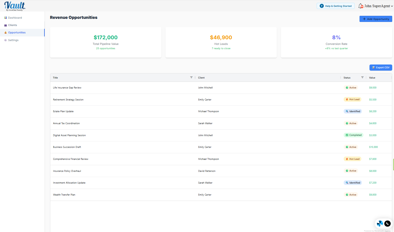 The Opportunities feature is your lightweight revenue pipeline inside iVault. It helps you capture planning needs you discover while working in client vaults, and it keeps your follow-up focused on the highest-value work.