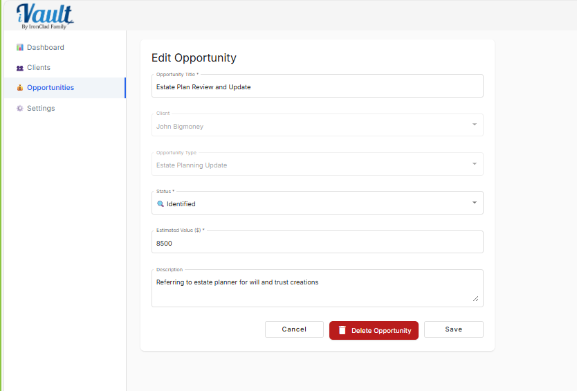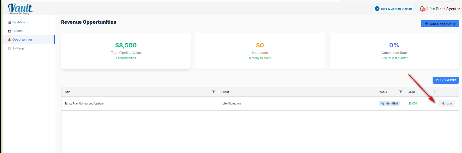 The Manage Opportunity screen is where you keep your pipeline accurate. Accurate pipeline tracking prevents forgotten follow-ups and makes dashboard numbers meaningful.